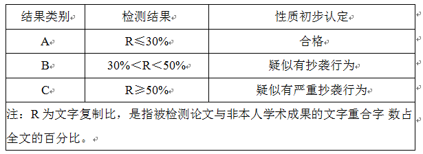 B类。学生须在指导教师指导下修改毕业论文,修改后再进行检测,检测合格者可申请答辩;修改后复制比仍大于30%小于50%的,由各学院答辩委员会根据具体情况(毕业论文核心内容是否存在抄袭现象)给出书面处理意见:①可申请答辩;②需重做毕业论文,延期答辩。