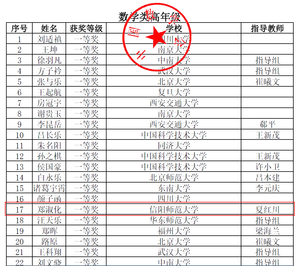 本次决赛,郑淑化是该组别河南省赛区唯一获得全国一等奖学生,也是同组别全国前20名中唯一的一名女生,领奖时受到颁奖嘉宾中国数学会理事长、中国科学院席南华院士的赞赏。