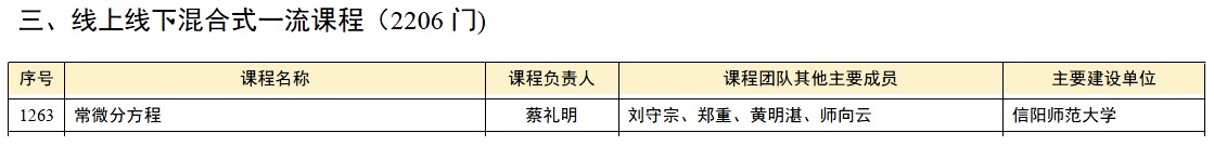 近日,教育部正式公布了第三批国家级一流本科课程认定结果公示名单, 自慰a片 蔡礼明教授作为负责人的《常微分方程》课程入选线上线下混合式一流课程