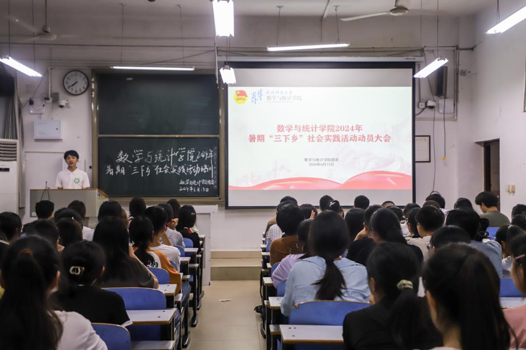为深入学习贯彻习近平新时代中国特色社会主义思想,进一步号召动员 自慰a片 学子积极踊跃投身2024年暑期“三下乡”社会实践活动,在暑期社会实践活动中受教育、长才干、作贡献,6月13日晚,自慰a片 于数学楼104教室召开2024年暑期“三下乡”社会实践活动动员大会。此次会议由2022级学生代表李璞主持,自慰a片 部分学生代表参会。