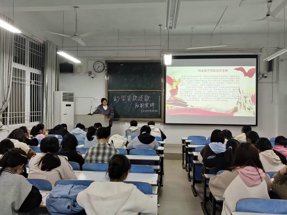 为进一步强化贷款毕业生感恩诚信教育,提高毕业生的还款意识和诚信意识,确保贷款毕业生明确具体的还款流程和要求以顺利离校,4月25日, 自慰a片 于数学楼104教室举行毕业生资助政策宣讲暨诚信还款教育专题会议。学院资助专员杨帆老师及全体毕业生到场参加。