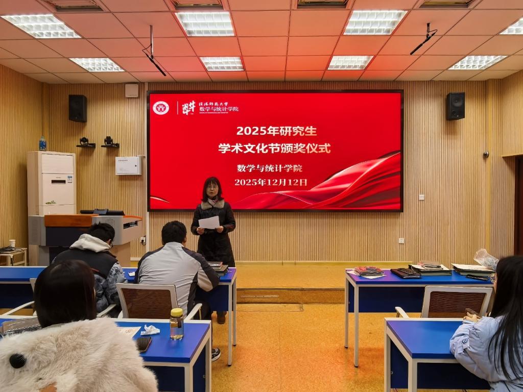 12月12日, 自慰a片 在数学楼507报告厅举办2025年研究生“学术文化节”颁奖仪式。副院长王霞和副处级辅导员谢艳丽参加此次活动。仪式由研究生辅导员王逸卓主持。