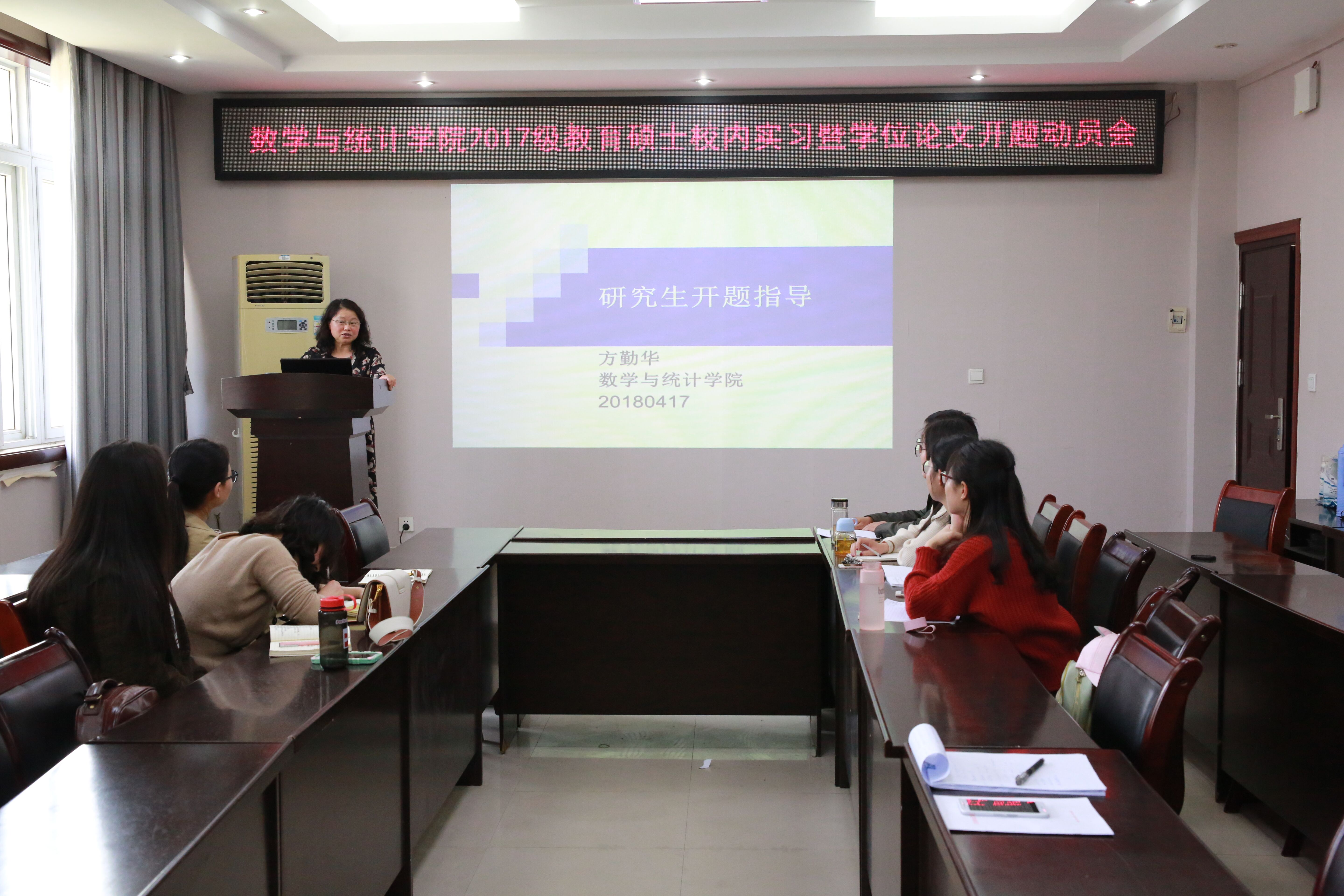 2018年4月17日下午, 自慰a片 在数学楼学术报告厅举办了2017级教育硕士校内实习暨学位论文开题动员会。 自慰a片 副院长陈越奋副教授,硕士生导师方勤华教授,研究生工作秘书郑重老师及全体2017级教育硕士参加了会议。