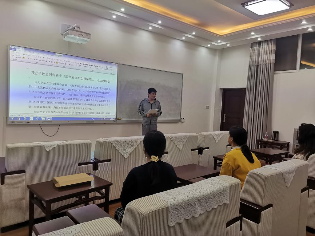 会上,郑重老师分别对《习近平致全国青联十三届全委会和全国学联二十七大的贺信》和《唱响新时代爱国团结跟党走的青春之歌——在中华全国青年联合会第十三届委员会全体会议和中华全国学生联合会第二十七次代表大会上的致词》这两个文件进行领学,并就习近平总书记重要指示精神进行研读。