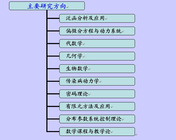 基础数学学科1996年被确定为学校首批重点建设学科,并在1998年校学科建设考核中荣获一等奖,2004年被遴选为河南省第六批重点建设学科,2008年被遴选为河南省第七批重点建设学科,2008年被遴选为学校重点建设的优势学科。本学科在泛函分析及应用、微分方程与动力系统、生物数学、代数学、几何学、密码理论、复杂系统的建模与控制等研究方向上形成了自己的特色和优势。
