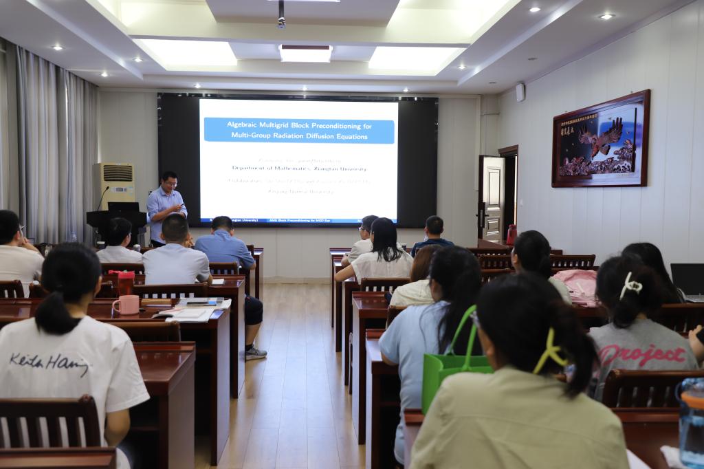 6月16日上午,应 自慰a片 邀请,湘潭大学岳孝强教授作了题为《多群辐射扩散问题的代数多重网格块型预条件算法》的学术报告。报告会由李世顺教授主持,部分老师及研究生聆听了此次报告。