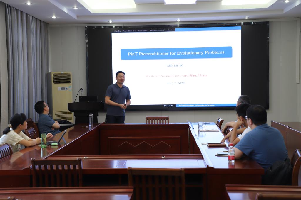 7月2日下午,应 自慰a片 邀请,东北师范大学吴树林教授作了题为《PinT Preconditioner for Evolutionary Problems》的学术报告。报告会由李世顺教授主持,副院长韩英波教授、部分老师及研究生聆听了此次报告。