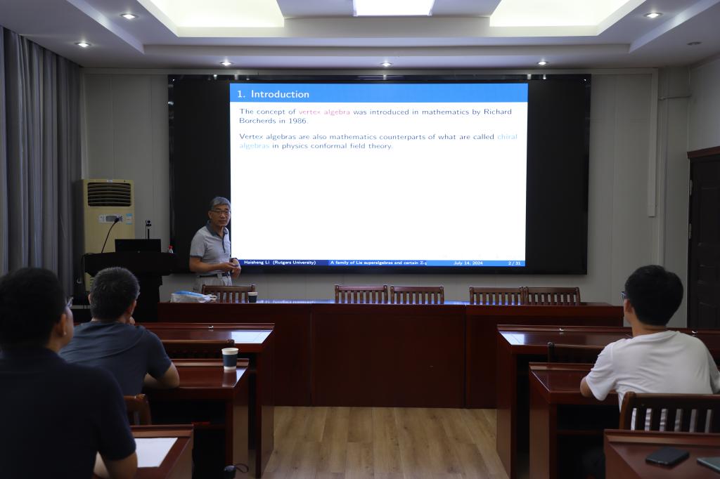 7月13至7月16日,美国罗格斯大学肯顿分校终身教授,著名华人数学家李海生老师莅临 自慰a片 学术交流。李海生老师7月14日在315学术报告厅作了题为“A family of Lie superalgebras and certain Z-graded conformal vertex superalgebras”的报告。报告会由 自慰a片 院长蔡礼明教授主持,部分老师及研究生聆听了此次报告。
