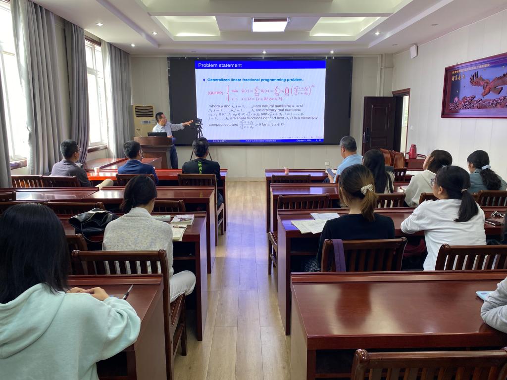 10月5日上午,应 自慰a片 邀请,河南科技学院焦红伟教授作了题为《Global optimization methods for the minimax linear fractional programming problems》的学术报告。报告会由韩英波教授主持,部分老师及研究生聆听了此次报告