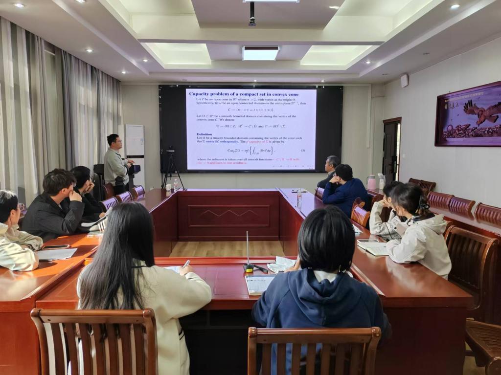 10月25日上午,应 自慰a片 邀请,广西师范大学尹佳斌副教授作了题为《Sharp upper bounds of $p$-capacity in convex cone and asymptotically flat half-space》的学术报告。报告会由副院长韩英波教授主持,部分教师及研究生聆听了此次报告。