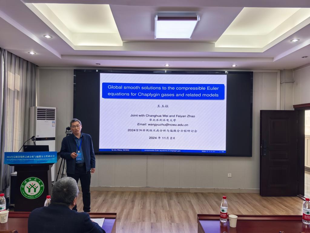 第1场报告由华北水利水电大学的王玉柱教授作了题目为《Global smooth solutions to the compressible Euler equations for Chaplygin gases and related models》的学术报告。