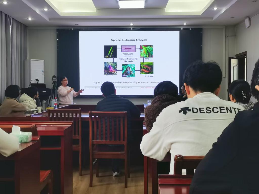 11月10日上午,应 自慰a片 邀请,陕西师范大学舒洪英教授在数学楼315会议室为 自慰a片 师生作了题为“Spatiotemporal dynamics of a structured spruce budworm diffusive model”的学术报告。报告由副院长王霞教授主持,生物数学方向的老师及研究生聆听了此次报告。