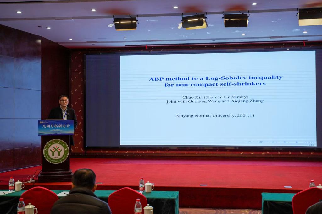 3场报告是由厦门大学的夏超教授作了题目为“ABP method to a Log-Sobolev inequality for non-compact self-shrinkers”的学术报告,此场报告由郑州大学的胡泽军教授主持。