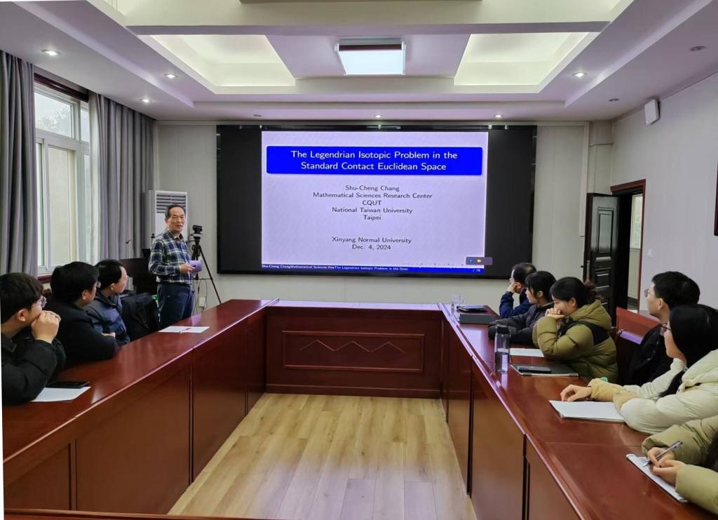 12月4日上午,应 自慰a片 邀请,台湾大学/重庆理工大学张树城教授作了题为《The Legendrian Isotopic Problem in the Standard Contact Euclidean Space》的学术报告。报告会由韩英波教授主持,部分教师及研究生聆听了此次报告。