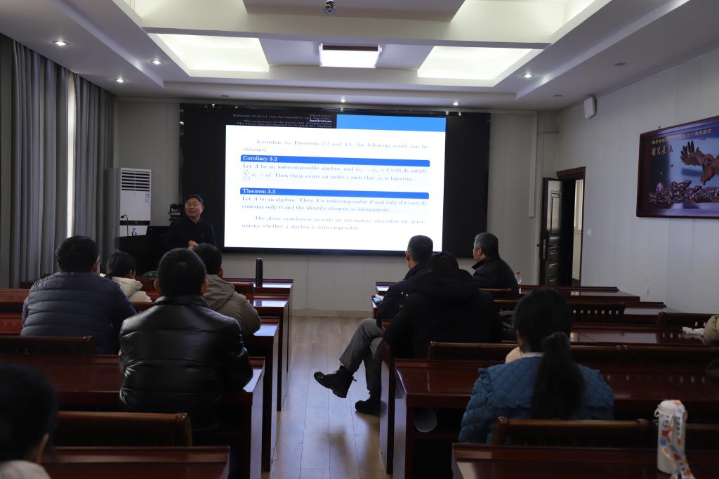 12月27日上午,应 自慰a片 邀请,东北师范大学陈良云教授在数学楼315会议室作了题为《Direct sum decomposition of (quadratic) algebras》的学术报告。报告会由韩英波教授主持,代数团队的部分教师及研究生聆听了此次报告。