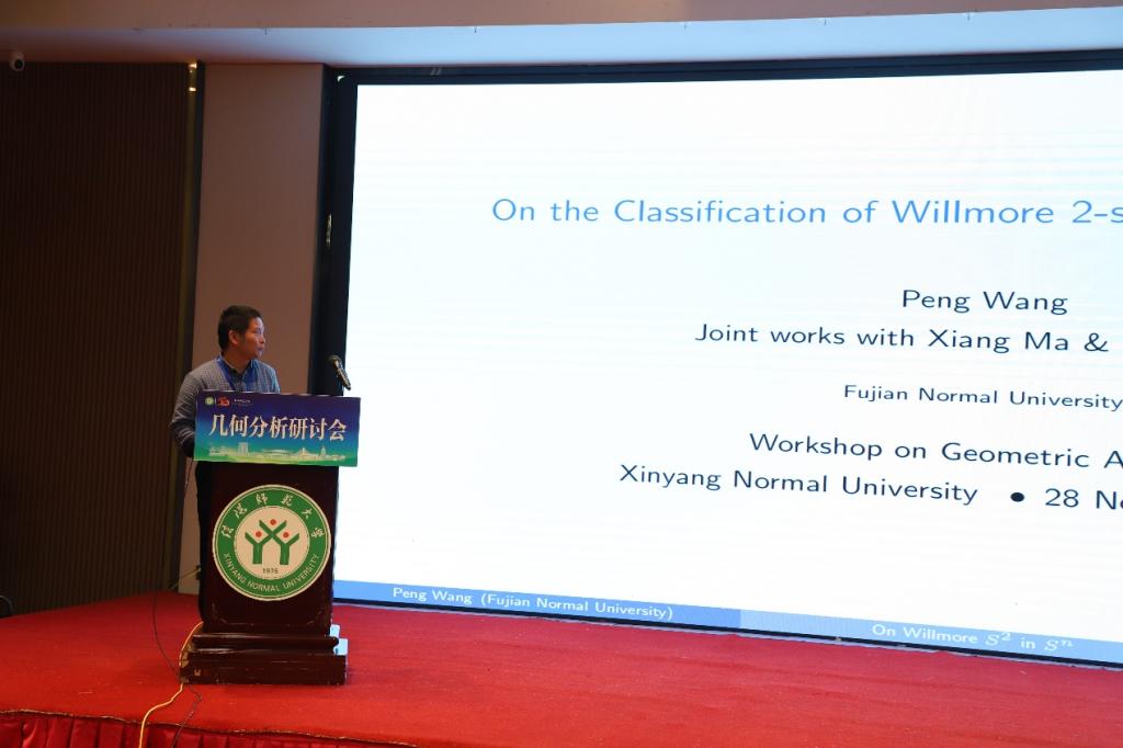 第三场报告中,福建师范大学王鹏教授作了题为《On the classification of Willmore 2-spheres in the n-sphere》的学术报告,由中国科学院大学焦晓祥教授主持。王教授在报告中完整分类了所有Willmore二维球面,将其分为三类:(1)满足“法向水平”条件的特殊扭量曲线投影;(2)具平面末端的严格m-各向同性Rn空间极小曲面;(3)由特定严格m-各向同性极小曲面经(mk)步伴随变换导出的严格k-各向同性Willmore球面。