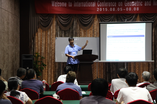 8月5日上午,第一场学术报告由浙江大学沈一兵教授主持。长江学者、北京大学朱小华教授作了题为《Properness of F-functionals》的报告,他证明了在任意锥凯勒-爱因斯坦流形上对F-泛函的适定性,并据此给出了锥凯勒-爱因斯坦度量中连续性方法的开性的另一个证明。