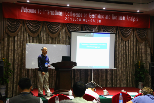第五场学术报告由韩国西江大学何柏通主持。台湾屏东大学吴进通教授作了题为《CR liner trace Li-Yau-Hamilton inequality》的报告,通过适当地调整Li-Yau方法给出了CR热方程解的梯度估计及Harnack不等式。这类方法也可应用于CR Yamabe流,对探究CR几何将会起重要作用。