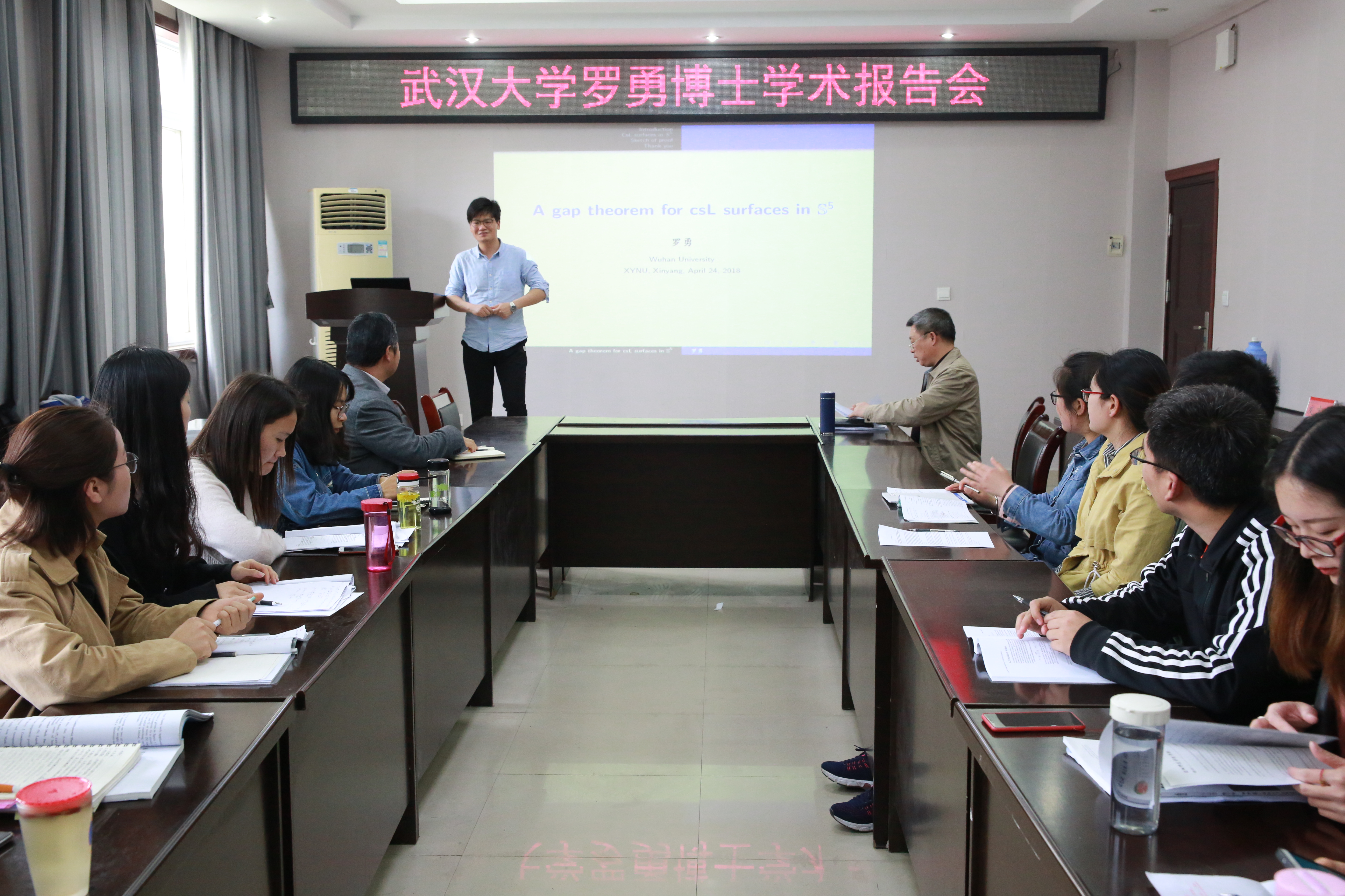 2018年4月24日下午,应 自慰a片 邀请,武汉大学罗勇博士在数学学院院学术报告厅作了题为“ A gap theorem for csl surfaces in five dimensional sphere”的学术报告,报告会由 自慰a片 院长胡余旺教授主持,该院的部分教师和研究生聆听了此次报告。