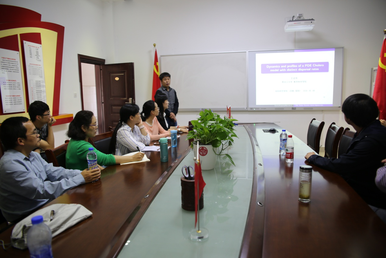 2018年5月8日下午,应 自慰a片 邀请,黑龙江大学王金良教授在数学学院党员之家作了题为“Dynamics and profiles of a PDE Cholera model with distinct dispersal rates”的学术报告。报告会由 自慰a片 党委书记王娟副教授主持,学院部分教师、研究生聆听了此次报告。