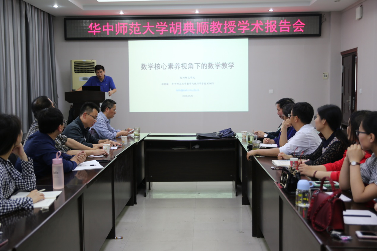 2018年5月20日下午,应 自慰a片 邀请,华中师范大学胡典顺教授在数学学院学术报告厅作了题为“数学核心素养视角下的数学教学”的学术报告。报告会由 自慰a片 副院长蔡礼明教授主持,该院部分校外指导教师和学院青年教师、研究生聆听了此次报告。