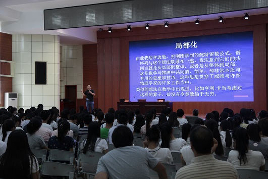 刘张炬教授以《对称与守恒》为主题,结合具体的几何图形阐述了“一系列对称存在的情况下一定能产生一个守恒量”的观点,深入浅出地讲解了数学几何的对称性与物理量守恒的深刻内在联系。其语言通俗、思路清晰、板书简明,获得了现场师生阵阵掌声。