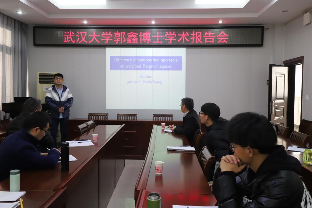 12月11日,应 自慰a片 邀请,武汉大学郭鑫博士在 自慰a片 学术报告厅作了一场题为《Difference of composition operators on weighted Bergman spaces》的学术报告。报告会由 自慰a片 副院长蔡礼明教授主持,学院部分老师,研究生和该领域相关博士聆听了此次报告。