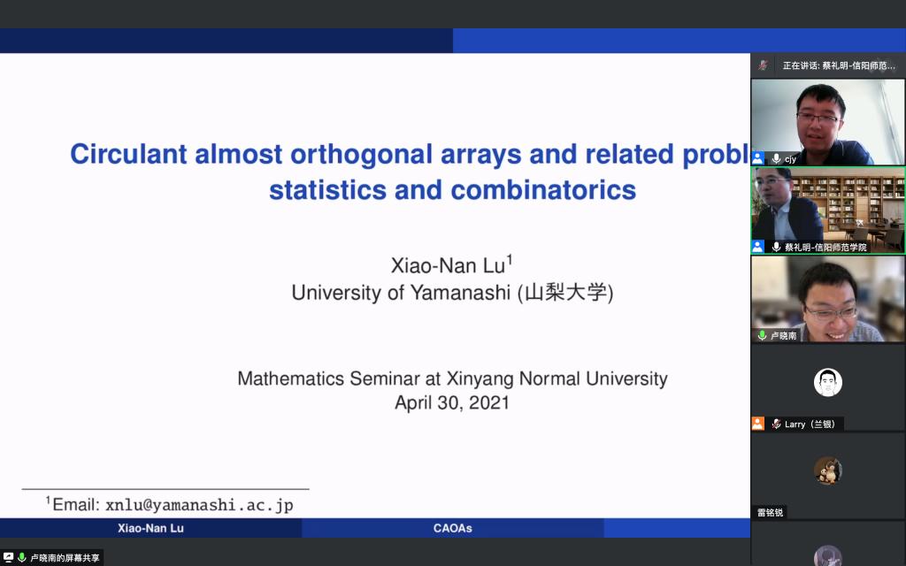 4月30日下午,应 自慰a片 邀请,日本山梨大学卢晓南博士通过腾讯会议平台做了一场题为《Circulant almost orthogonal arrays and related problems in statistics and combinatorics》的在线学术报告。报告会由 自慰a片 副院长蔡礼明教授主持,学院部分老师和研究生聆听了此次报告。