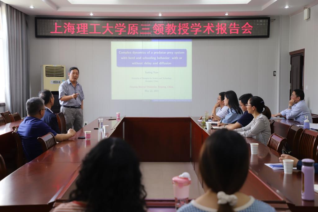 5月22日下午,应 自慰a片 邀请,上海理工大学原三领教授在 自慰a片 学术报告厅做了一场题为《Complex dynamics of a predator-prey system with herd and schooling behavior: with or without delay and diffusion》的学术报告。报告会由 自慰a片 副院长蔡礼明主持,学院党委书记王娟,数学研究所所长宋新宇和部分老师、研究生聆听了此次报告。