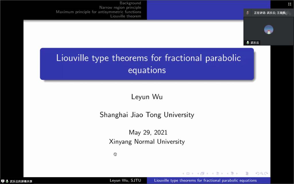 5月29日上午,应 自慰a片 邀请,上海交通大学武乐云博士通过腾讯会议平台做了一场题为《Liouville theorems for entire solutions to fractional parabolic equations》的线上学术报告。报告会由 自慰a片 副院长蔡礼明教授主持,学院部分老师和研究生聆听了此次报告。
