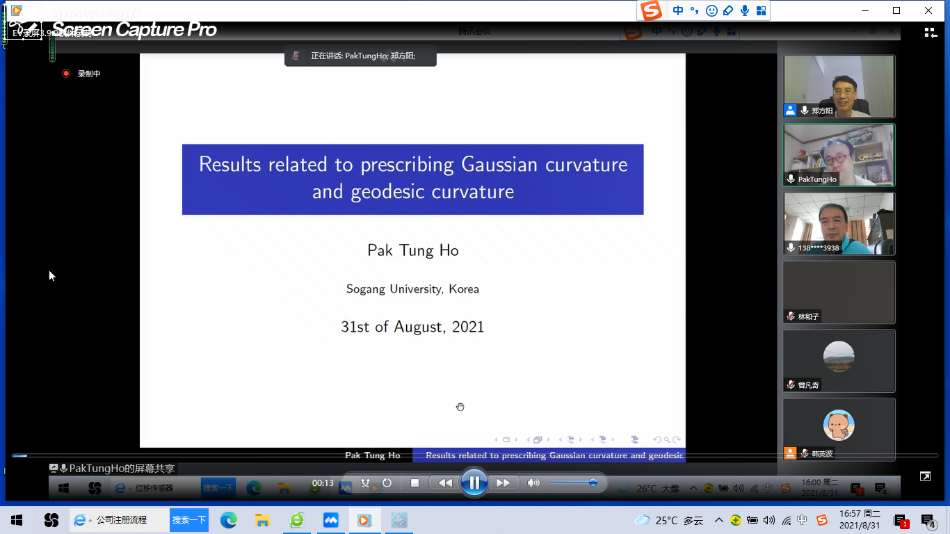 第2场报告由韩国西江大学何柏通教授报告,题目为《Results related to prescribing Gaussian curvature and geodesic curvature》。在报告中,何柏通教授首先讨论曲面上与预定高斯曲率相关的结果。然后讨论了带边界的曲面上与预定高斯曲率或测地线曲率相关的结果。