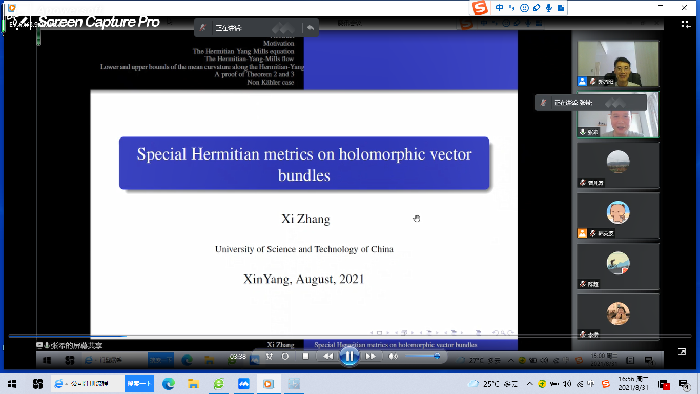第1场报告由中国科学技术大学张希教授报告,题目为《Special Hermitian metrics on holomorphic vector bundles》。在报告中,张希教授首先提出一个自然的问题:一个全纯向量丛上是否存在具有负平均曲率或正平均曲率的 Hermitian 度量?然后张希教授介绍他们最近在全纯向量丛上的 Hermitian-Yang-Mills 流方面的工作。特别地,他们利用Hermitian-Yang-Mills 流的结果解决了上面的问题。