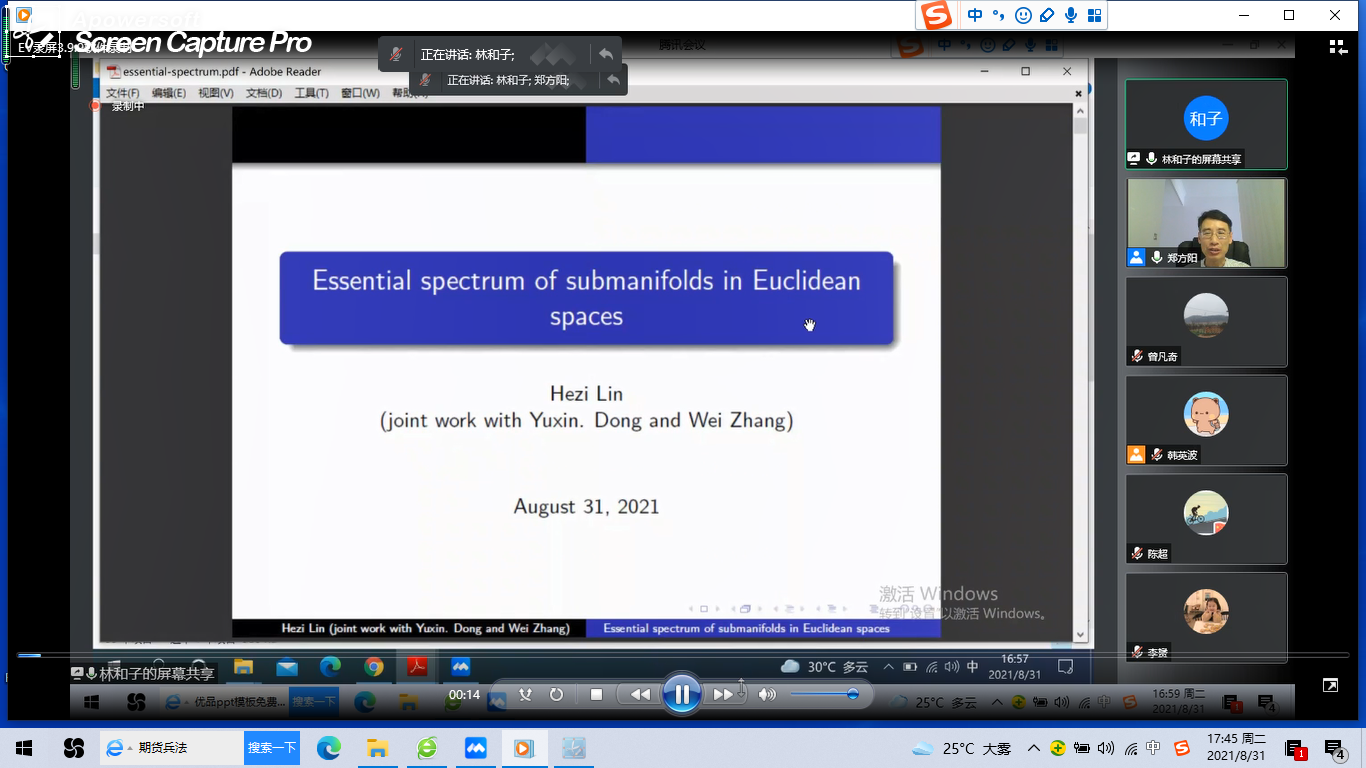 第3场报告由福建师范大学林和子教授报告,题目为《Essential spectrum of submanifolds in Euclidean spaces》。在报告中,林和子教授主要讨论了在各种几何条件下欧式空间中子流形的本性谱问题