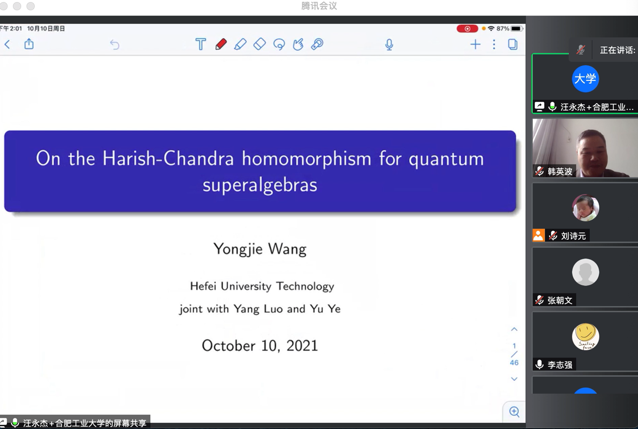 报告中汪永杰博士介绍了李代数的 Harsh-Chandra 以及其在量子超代数情形中的推广,介绍了其在确定相关量子超代数中心中的作用以及该问题研究的最新进展。报告结束后,汪永杰博士针对师生们提出的问题给出了详细的解答,并与师生就报告内容进行了热烈的讨论,此次学术报告会既开阔了大家的视野,又提供了研究思路。
