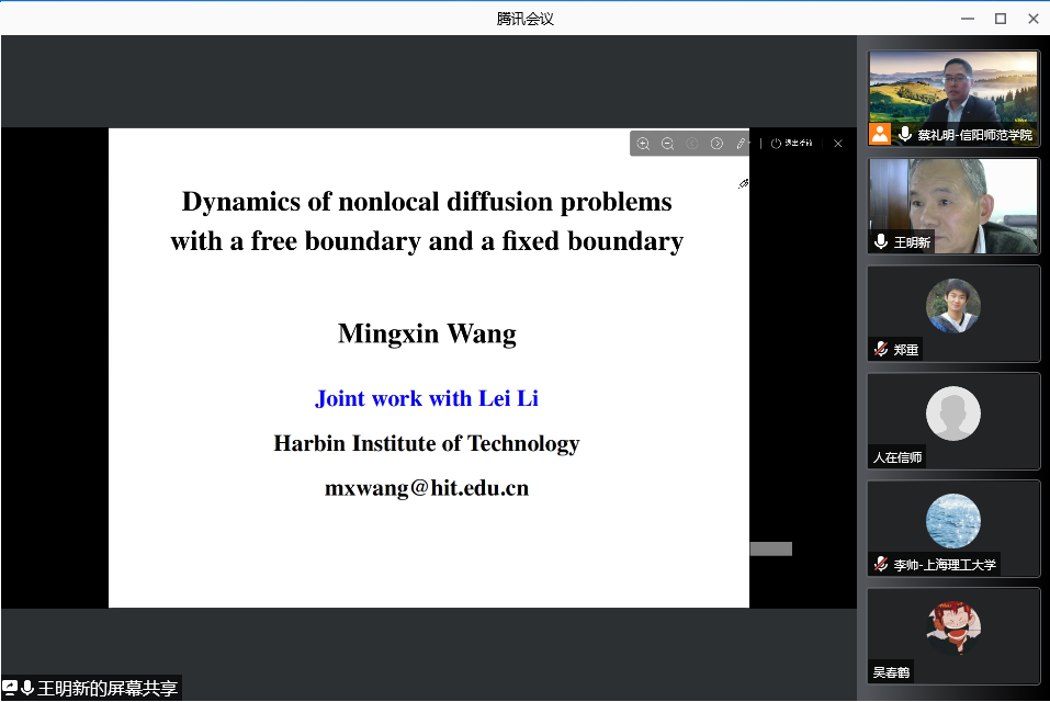 11月5日上午,应 自慰a片 邀请,哈尔滨工业大学王明新教授通过腾讯会议平台为自慰a片 研究生及相关研究方向老师作了题为《Non-local diffusion problems with a free boundary and a fixed boundary》的学术报告。报告会由 自慰a片 院长蔡礼明教授主持。