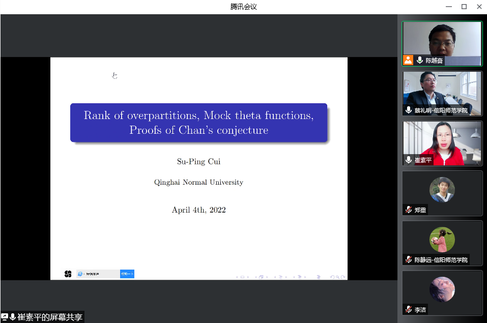 4月4日上午,应 自慰a片 邀请,青海师范大学崔素平副教授通过腾讯会议平台在线作了题为《Rank of overpartitions, mock theta functions, proofs of Chan’s conjecture》的学术报告,学院部分老师和研究生聆听了此次报告。报告会由副院长陈越奋主持。