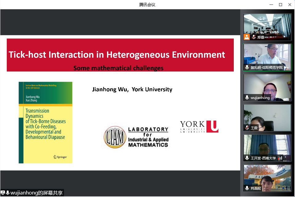 5月7日上午,应 自慰a片 邀请,加拿大约克大学吴建宏教授通过腾讯会议平台在线作了题为《Tick-host Interaction in Heterogeneous Environment》的学术报告,来自西安交通大学、西南大学、上海师范大学、上海海事大学、香港理工大学等单位的专家及学院部分教师、研究生共100余人聆听了此次报告。报告会由 自慰a片 院长蔡礼明教授主持。