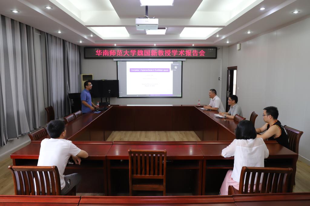 邀请,华南师范大学魏国新教授在315会议室做了一场题为《Complete λ-hypersurfaces in Euclidean space》的学术报告。院长蔡礼明,副院长韩英波和学院部分教师在315会议室及腾讯会议平台聆听了此次报告。报告会由副院长韩英波教授主持。
