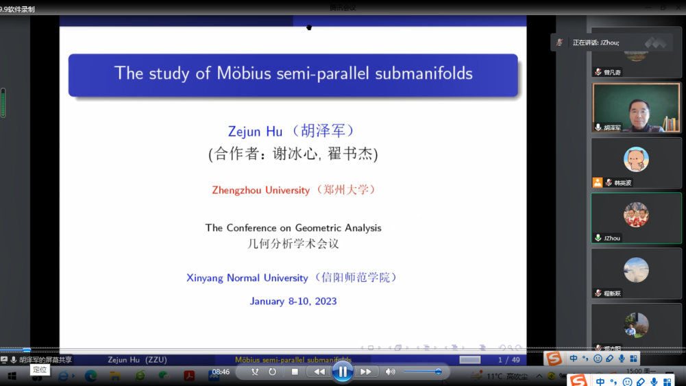 1场报告由郑州大学胡泽军教授报告,题目为《The study of Moebius semi-parallel submanifolds》。在报告中,胡泽军教授讨论了n+p维单位球面上的nMoebius 半平行子流形的几何性质。