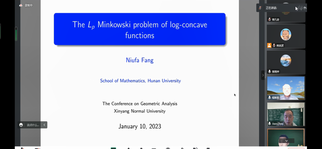 2场报告由湖南大学方牛发教授报告,题目为《The Lp Minkowski problem of log-concave functions》。在报告中,方牛发教授讨论了关于对数凹函数的Lp Minkowski问题