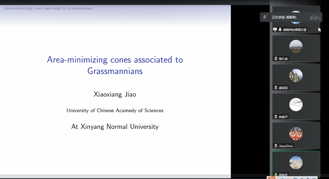 1场报告由中国科学院大焦晓祥教授报告,题目为《Area-minimizing cones associated to Grassmannians》。在报告中,焦晓祥教授运用Lawlor 的方法发现了许多新的面积最小的锥,它们是由定向和不定向(实)子空间组成的Grassmann 流形张成的锥、复Grassmann 流形和四元素Grassmann 流形张成的锥以及它们的乘积流形张成的锥,同时发现Lawlor的临界的情况,也就是Grassmann 流形乘积的锥的维数为7 维的情况有几类也是面积最小的。。