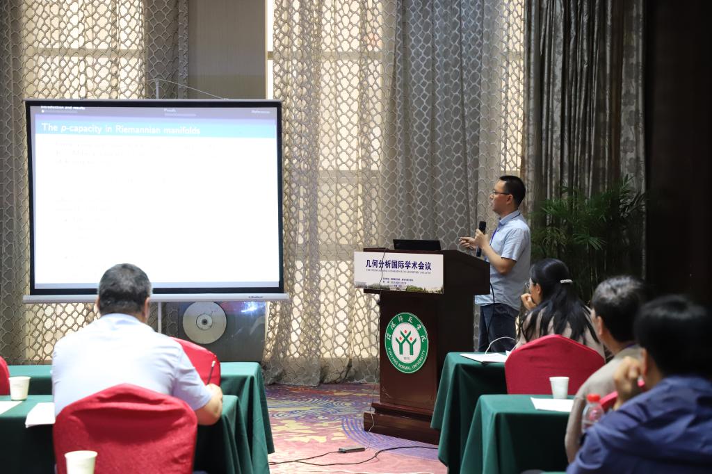 第2场报告由四川大学熊昌伟教授报告,题目为《Sharp upper bounds for the capacity in the hyperbolic and Euclidean spaces》。在报告中,熊昌伟教授利用逆平均曲率流的工具得到欧式空间和双曲空间上光滑紧集的容积的各种最优上界估计。