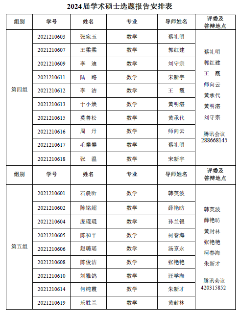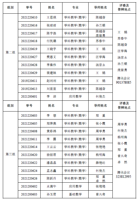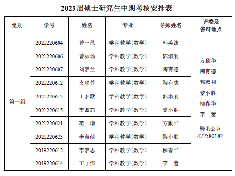 自慰a片 2022-2023 学年第一学期 2021级专业硕士研究 生(两年制专业硕士)、2021 级同等学力研究生、2019 级硕师计划研 究生学位论文中期考核和 2021 级学术硕士研究生(三年制学术硕士)学位论文选题报告答辩会定于 2023年 1月 6日14:30—18:00在腾讯会议平台举行,具体分组见下表。参加答辩的同学需提前填写好《信阳师范学院硕士研究生学位论文选题报告》或《信阳师范学院硕士研究生中期考核表》,并按照选题报告或中期考核所列内容准备 12 分钟左右的汇报课件参加答辩,届时不参加答辩的同学视为考核不通过。