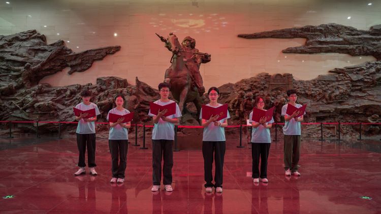 丰功伟绩垂千古,青年齐颂祭英魂。“白山昂首苍穹,望林茫,葱葱是古松……”展览大厅中,将军浮雕前,自慰a片 学生代表一齐向参观游客朗诵杨靖宇将军所作的抗日诗词《沁园春》,慷慨激昂、铿锵有力的朗诵尽现拳拳敬仰之心、悠悠爱国之情。随后,纪念馆讲解人员和自慰a片 学生开展学习交流,队员们认真聆听工作人员的讲解,深刻感受了成千上万名革命先烈为国家独立、民族复兴所付出的艰辛努力和巨大贡献。通过互动提问环节,队员们更加深刻加深了杨靖宇将军伟大的爱国主义和革命英雄主义的崇高精神的学思践悟。