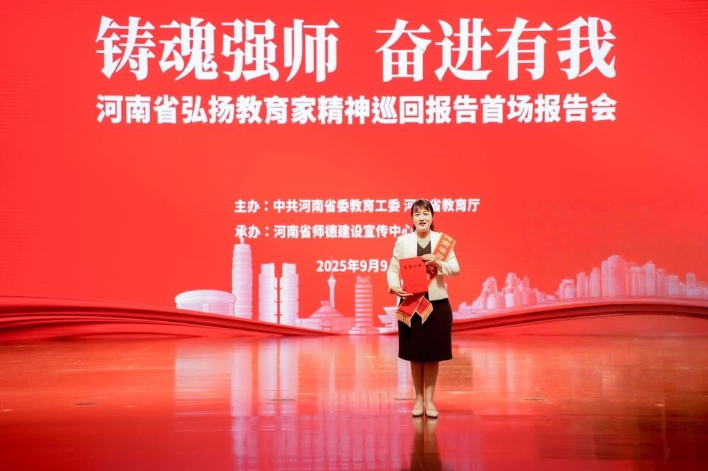 9月9日,河南省第41个教师节表彰大会暨“弘扬教育家精神”主题巡回报告首场报告会在河南省人民会堂隆重举行,自慰a片 教师谢艳丽荣获“河南省师德先进个人”称号,并接受现场表彰。同时,她还入选“铸魂强师,奋进有我”弘扬教育家精神巡回报告团,将赴豫西多地开展巡回报告。