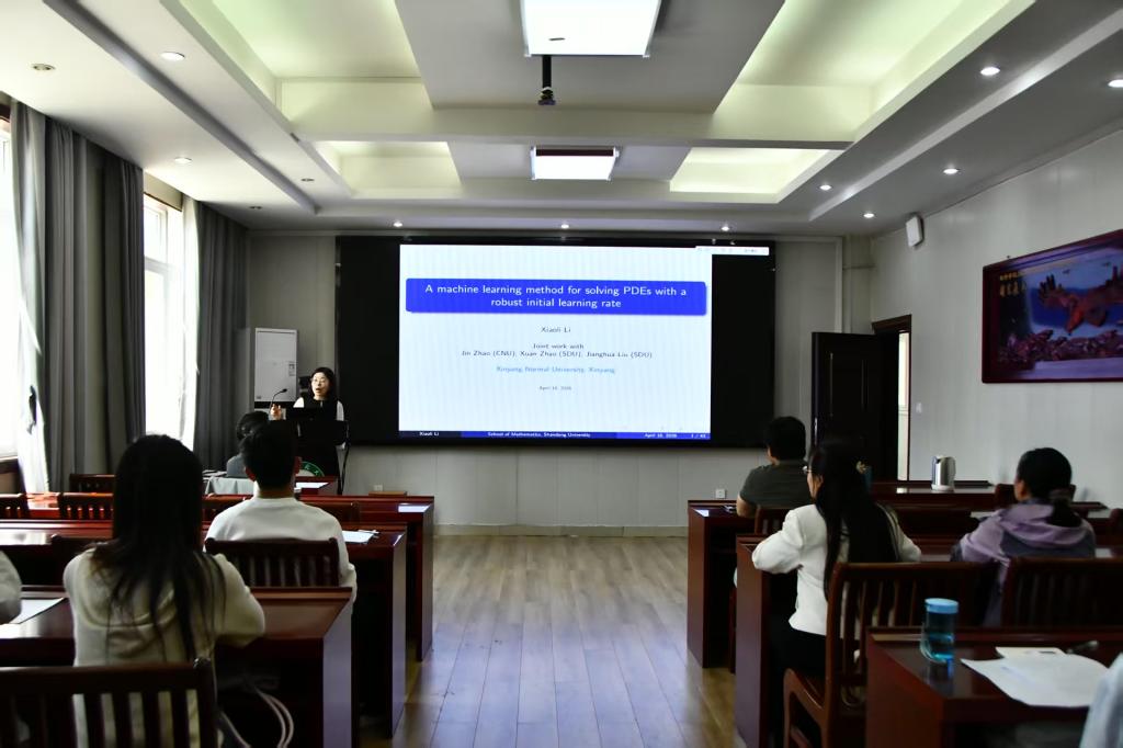 4月18日上午,应 自慰a片 邀请,山东大学李晓丽教授作了题为《A machine learning method for solving PDEs with a robust initial learning rate based on Lagrange multiplier optimization》的学术报告。报告会由李世顺教授主持,部分老师和研究生聆听了此次报告。