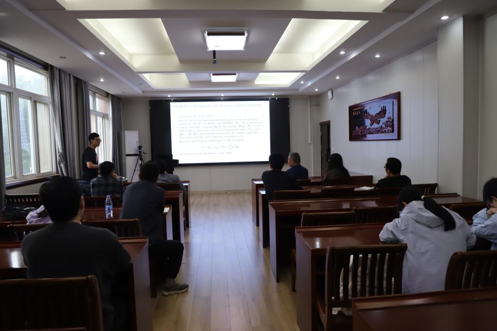 桂耀挺副教授在本次报告中,围绕“渐近平坦流行中平均曲率流的稳定性”这一课题,首先回顾了欧氏空间中保体积平均曲率的研究,进而介绍了空间形式中保体积曲率流的研究进展,最后详细讲解了他们在渐近平坦流形中保面积曲率流的稳定性方面取得的成果。