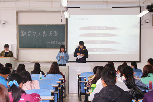 复赛分为百科知识竞答、扑克24点、猜价格、魅力演说四个环节,选手们3人一组分为8个小组参与挑战。百科知识竞答环节中,各小组均派出本组的“智囊”选手参与抢答,不论是人文、诗词、历史、生活、社会相关的题目,达人们都能对答如流,展现出当代大学生丰富的知识储备。扑克24点与猜价格环节打破传统数学竞赛的形式,以创新的形式带来数学知识与逻辑推理的碰撞,考验选手的思维活跃性,其中,3组选手在众多难题前镇定自若,运用自如,为我们展示了数学达人不俗的敏捷性和反应力。魅力演说环节中,小组代表依次上台,结合精美的PPT与适当的背景音乐,展示数学达人们的共性和个性,为我们带来别开生面的精彩演说。