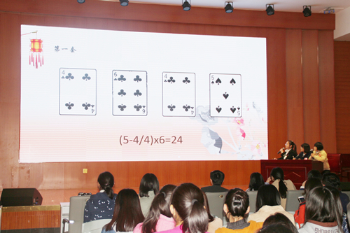 青春活力的开场舞拉开了比赛帷幕。经过激烈角逐,共有数学与统计学院、历史文化学院等院系的六组选手脱颖而出,成功晋级决赛。比赛涵盖“百科知识竞答”、“扑克24点”、“猜价格”和“魅力演说”四个环节。“百科知识竞答”环节中,选手们反应敏捷、答题准确,面对涵盖人文、诗词、历史、生活、社会等各类题目冷静思考、踊跃抢答,展现出当代大学生丰富的知识储备。“扑克24点”环节中,每组选手分工明确、默契配合,彰显出“数学达人”超凡的逻辑思维能力。“猜价格”环节中,选手们争分夺秒、增减有序,将现场气氛推向高潮。“魅力演说”环节中,小组代表们将精美的PPT与恰当的演说相结合,向大家展示了奇妙有趣的数学文化及自己学习数学的心路历程。其中,第四组选手代表通过现场互动,让观众亲手体验数学之妙,赢得一致好评;第六组选手代表以“黄金分割”为主题,其幽默风趣的语言、深入浅出的讲解令现场学子纷纷表示受益匪浅。期间穿插的互动环节,观众积极参与,气氛活跃,笑声不断,营造良好的现场氛围。最后,第四组选手凭借团结合作、头脑清新、思维敏捷的精彩表现获得本次比赛一等奖。
