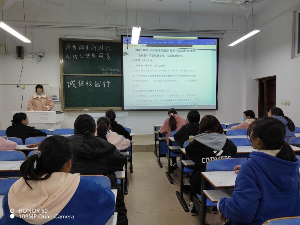 经过初赛的激烈角逐,5名同学脱颖而出,成功晋级复赛。此次比赛主要以书面作答形式进行,同学们先按照提前安排好的座次依次间隔就坐,答卷结束后由相关负责人根据题库的答案进行改卷打分,试卷满分为100分,最后按照总分排名,选取前5名同学参加学校的复赛。在初赛前的准备阶段,参赛的同学们按照活动群里提供的题库积极备赛,认真准备。在初赛的进行阶段,参赛同学积极答题,态度认真,在大家共同的协调和配合下,“诚信校园行”知识竞赛初赛取得圆满成功。